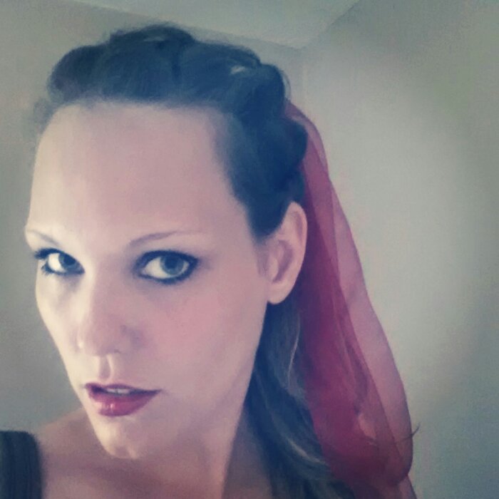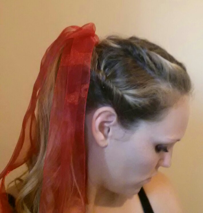 All I needed here was some red organza ribbon from Michael’s. I sectioned my hair into 5 and then rolled from the front to the back. And then put the rest up in a pony tail and wrapped the ribbon around letting the ends hang loose.