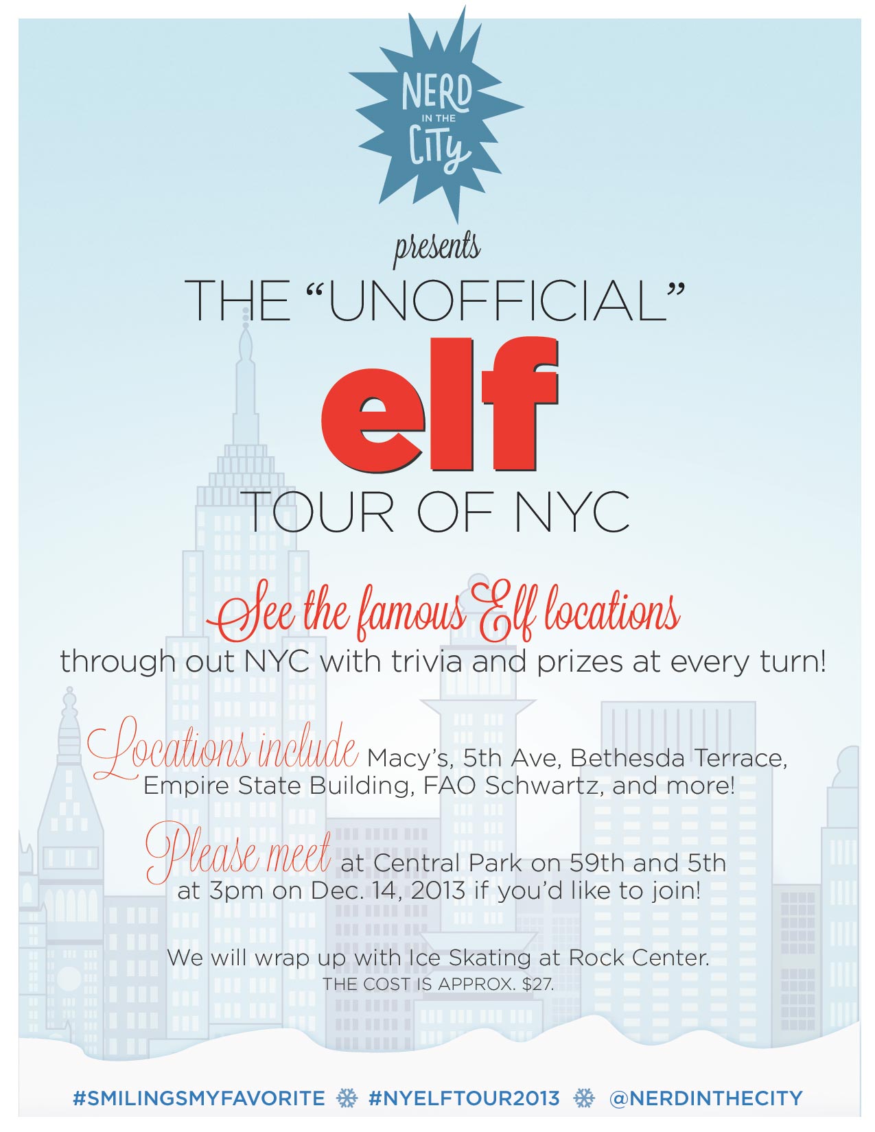 All nerds (and normals) are invited to come out this Saturday for Nerd in the City’s unofficial Elf tour of NYC. Check out our poster below.