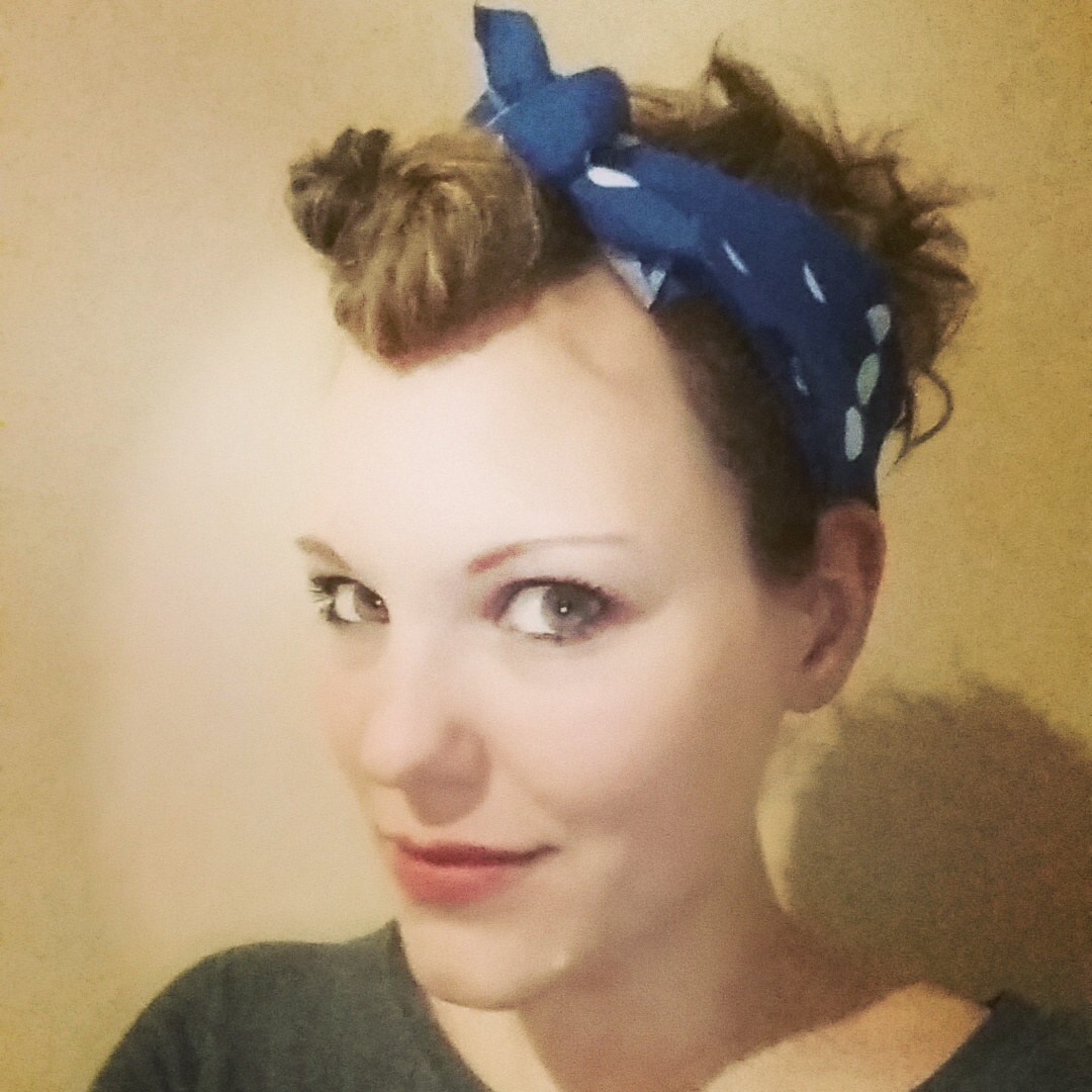 The main points to get here are the head scarf and the rolled bangs. It doesn’t matter what color scarf you get. As long as you have attitude to go along with it!
