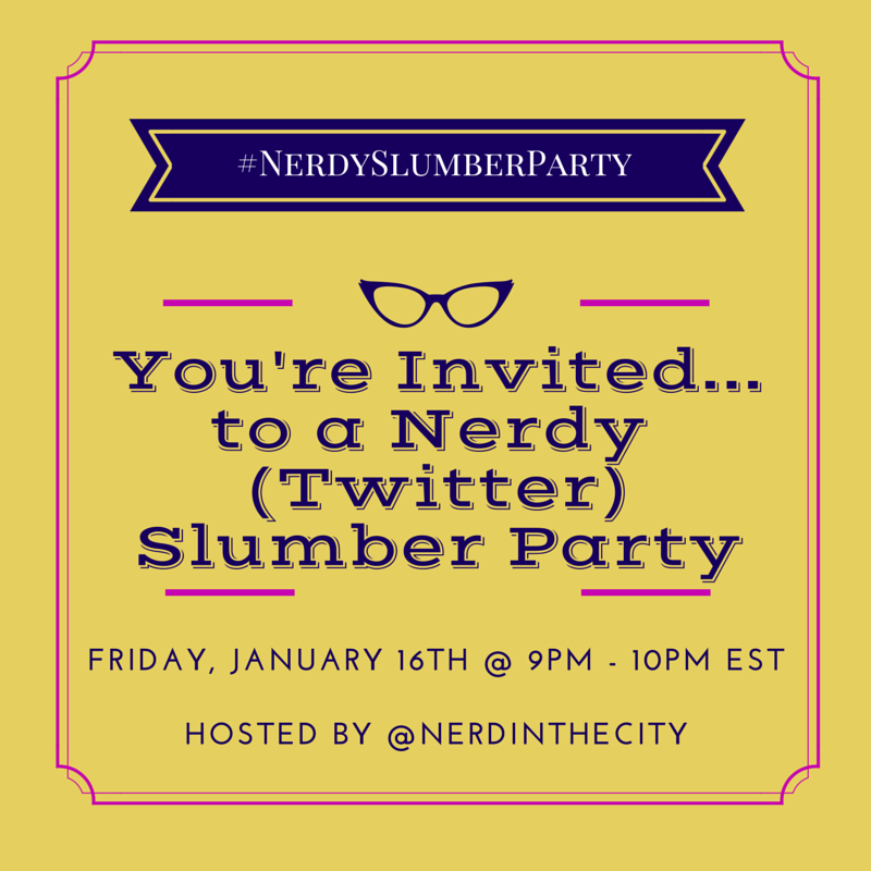 This Friday night at 9pm EST @NerdintheCity will be hosting a Twitter Slumber Party. Ok, we won’t actually be slumbering. We won’t even be in the same room. But there will be fun conversation and some seriously good giveaways!!