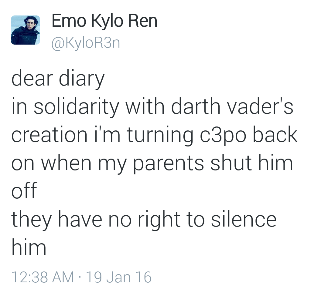 Do you love Star Wars? Did you see The Force Awakens and wonder to yourself “Hmmm…I wonder what kind of things that moody, little twerp Kylo Ren would tweet if they had such things as Twitter in that galaxy far, far away?” Well, wonder no more. Because Emo Kylo Ren exists for your reading pleasure on the Twittersphere!! And boy is he hilarious. Just take a look at the above tweets. There’s more where that came from. Go follow @KyloR3n right this instance!