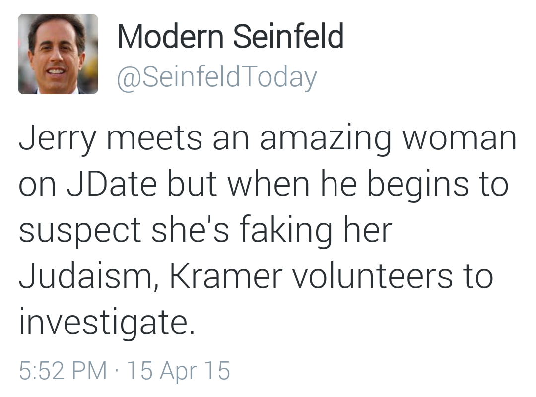 If Seinfeld was still on the air in the modern world and Jerry, Kramer, Elaine and George had to deal with things like: online dating, Tinder, Facebook, You Tube, Uber, etc….yep, it’s as funny as it sounds. Tweets like